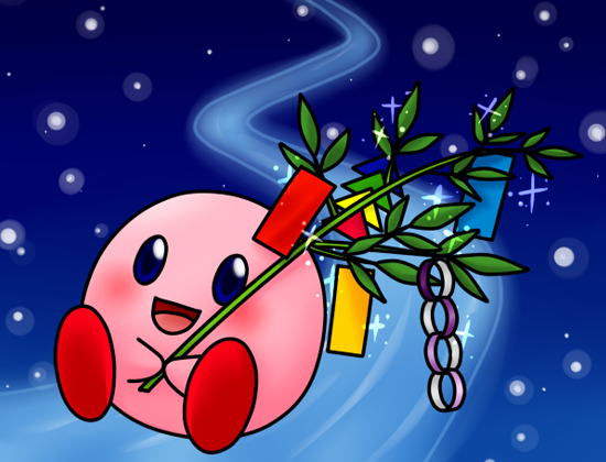 笹を持って天の川をすべるカービィ。